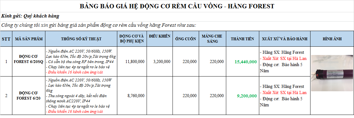 Công ty chúng tôi xin gửi bảng giá sản phẩm động cơ rèm cầu vồng tự động hãng FOREST như sau: