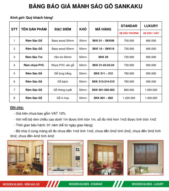 1 – BẢNG BÁO GIÁ RÈM SÁO GỖ HÃNG SANKAKU