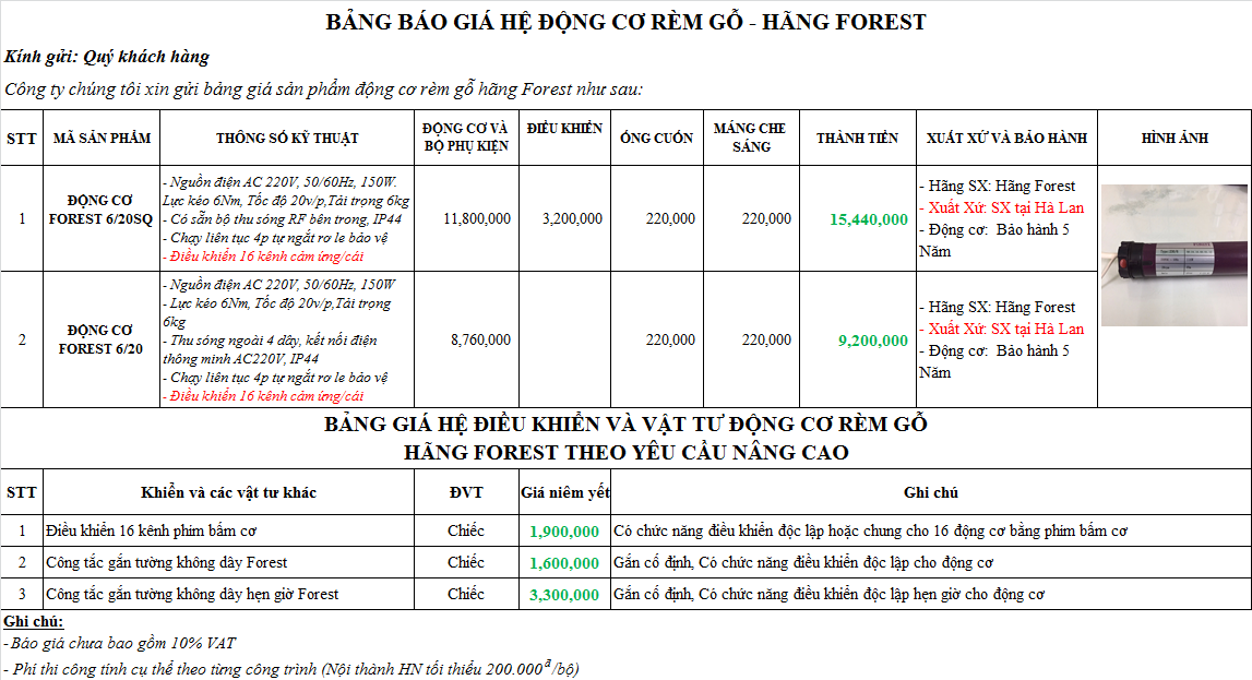 Công ty chúng tôi xin gửi bảng giá sản phẩm động cơ rèm gỗ tự động hãng FOREST như sau: