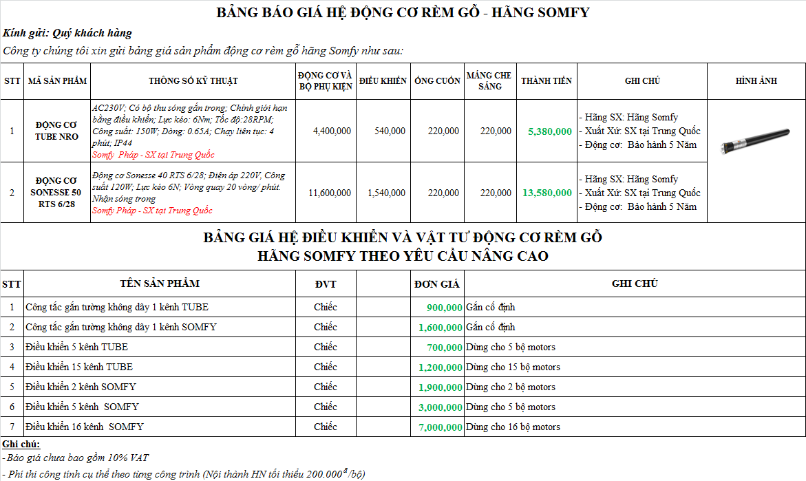 Công ty chúng tôi xin gửi bảng giá sản phẩm động cơ rèm gỗ tự động hãng SOMFY như sau: