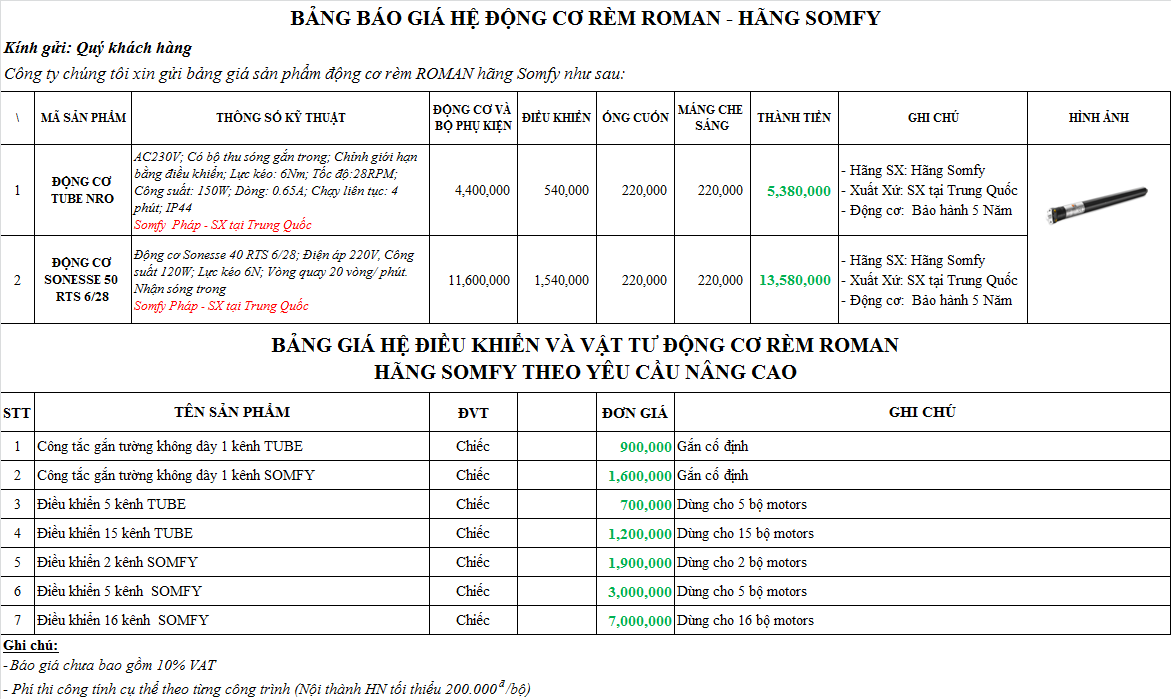 Công ty chúng tôi xin gửi bảng giá sản phẩm động cơ rèm ROMAN tự động hãng SOMFY như sau: