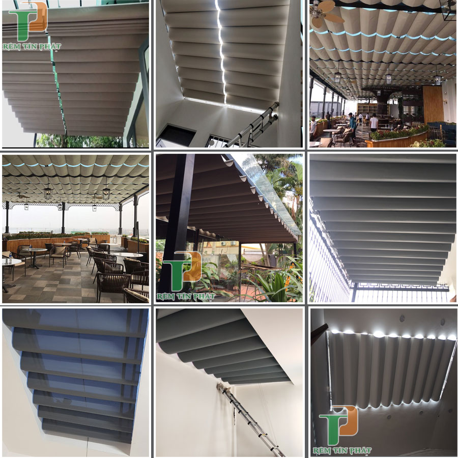 Rèm Cửa Tín Phát chuyên thi công lắp đặt rèm trần, rèm giếng trời, bạt trần tự động che nắng mưa ngoài trời… tại Hà Nội. Bạt trần được làm từ chất liệu vải bạt sợi poliste tổng hợp có khả năng cản 100% ánh nắng mặt trời, có tuổi thọ cao, thời gian sử dụng trên 5 năm.
