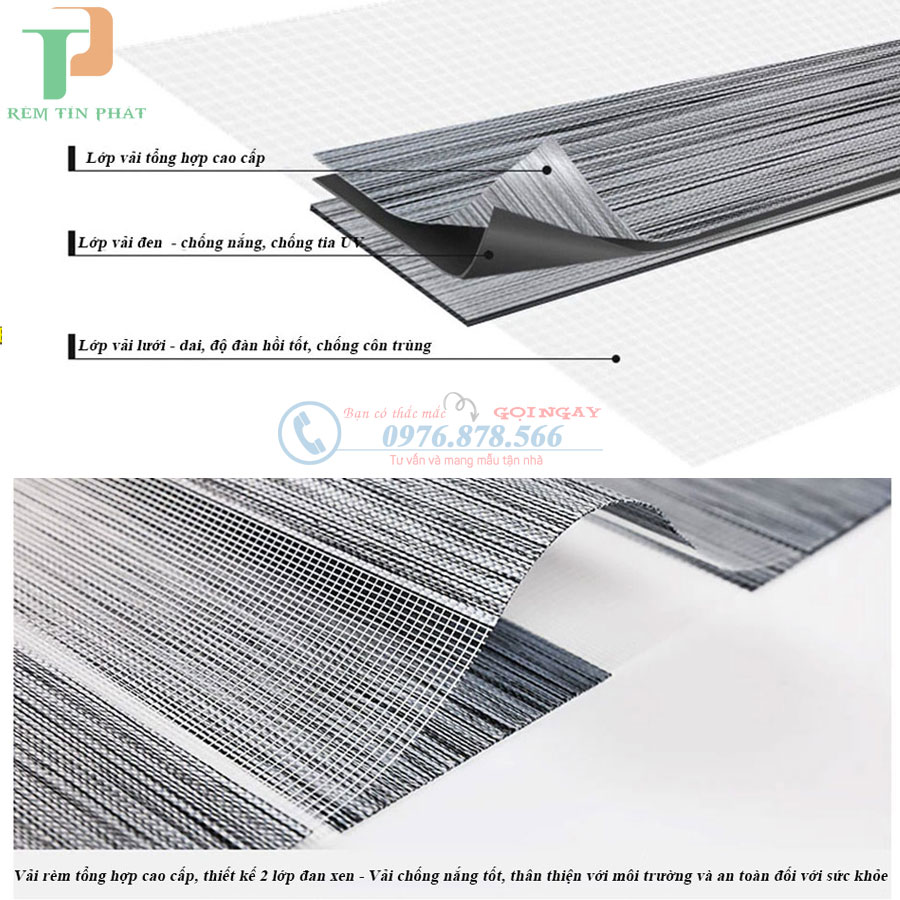 Rèm cầu vồng hãng FIVESTAR được làm từ vải tổng hợp polyester với hai dạng dệt hoàn toàn khác nhau. Trong đó, một lớp vải dày và khít có tác dụng che chắn ánh sáng. Một lớp vải mỏng như lưới giúp tạo ra không gian mở để bạn có thể nhìn xuyên ra bên ngoài. Chất liệu polyester cao cấp có độ bền rất cao, khả năng chống nắng tốt, thân thiện với môi trường và an toàn cho người sử dụng.