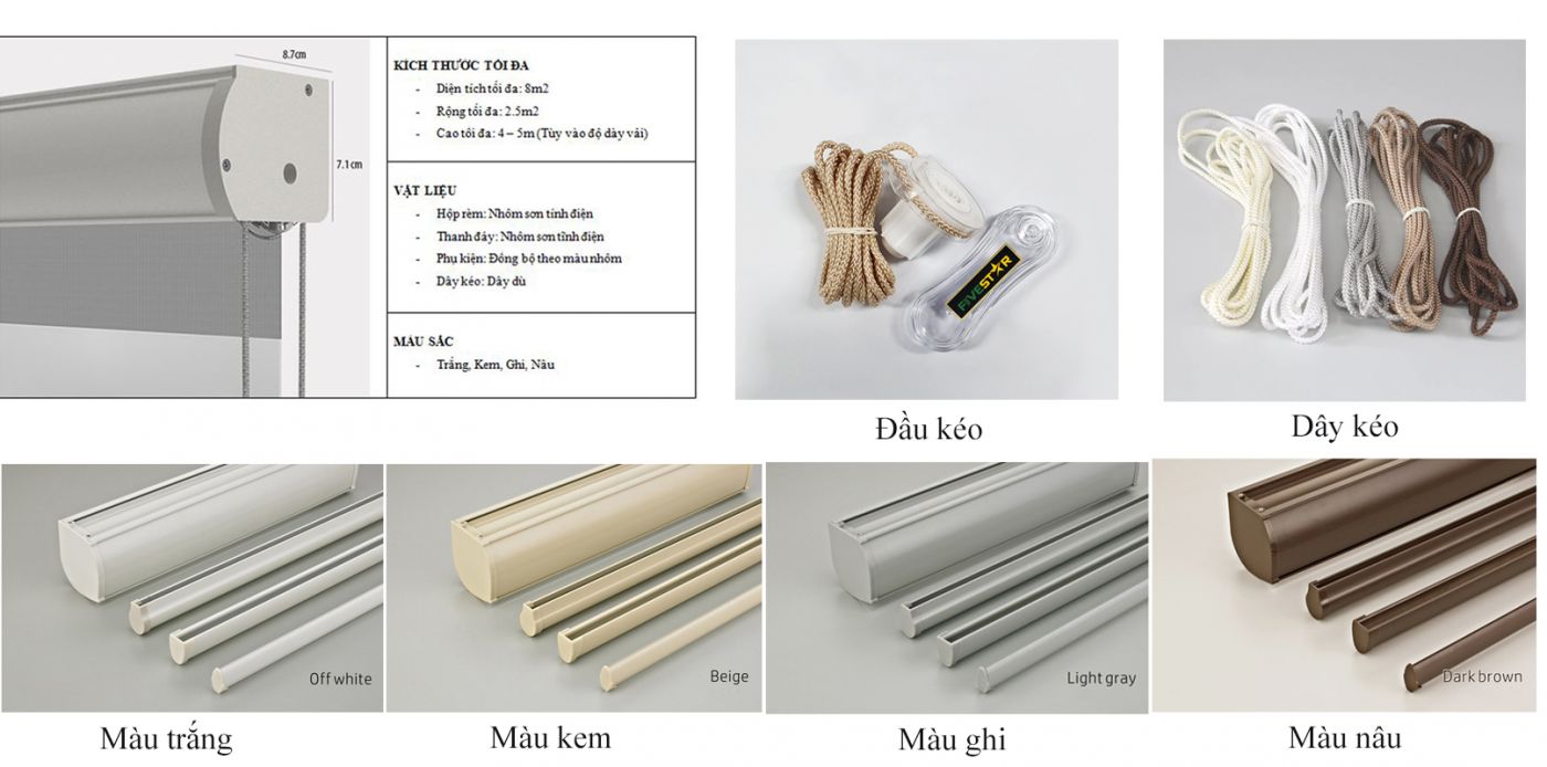 Hệ thống phụ kiện: ống cuộn rèm, thanh đáy, máng che được làm bằng chất liệu nhôm cao cấp, sơn tĩnh điện đồng màu với màu vải. Dây kéo làm bằng dây dù nhập khẩu Hàn Quốc. Củ quay làm bằng nhựa cao cấp có độ bền cao.
