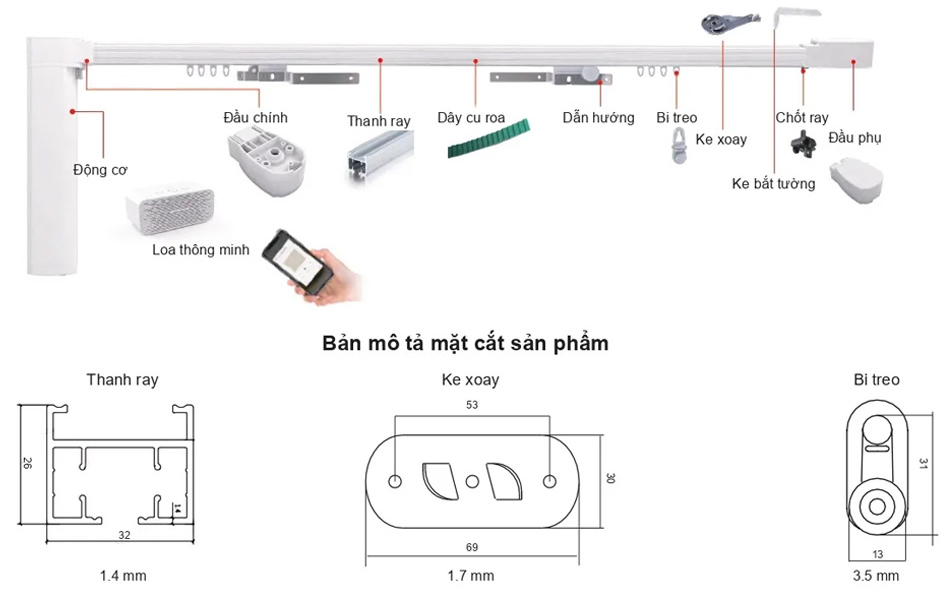 - Động cơ rèm; bộ phụ kiện và điều khiển từ xa: Là bộ phận chính giúp kéo/mở rèm, thường gắn trên thanh treo.